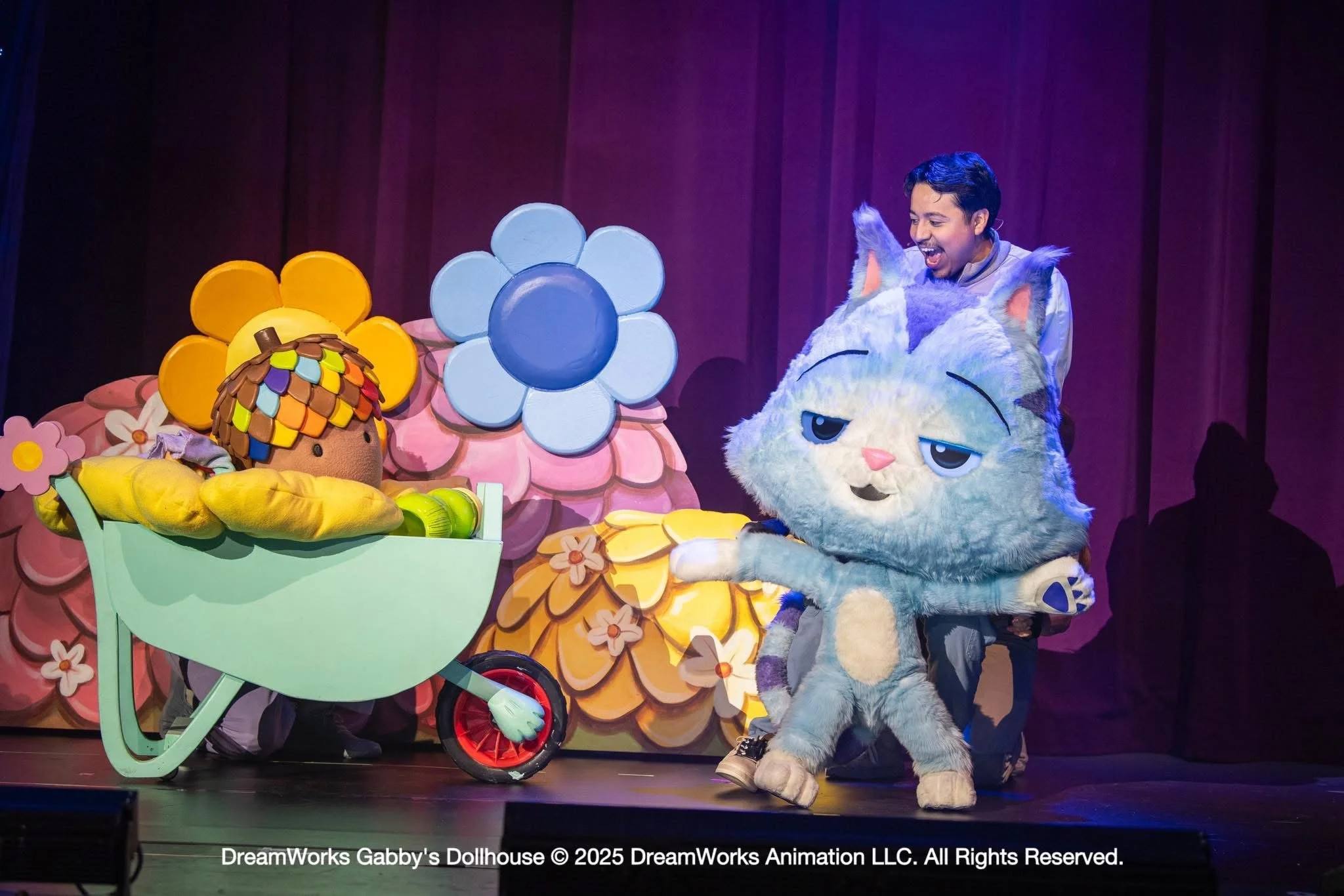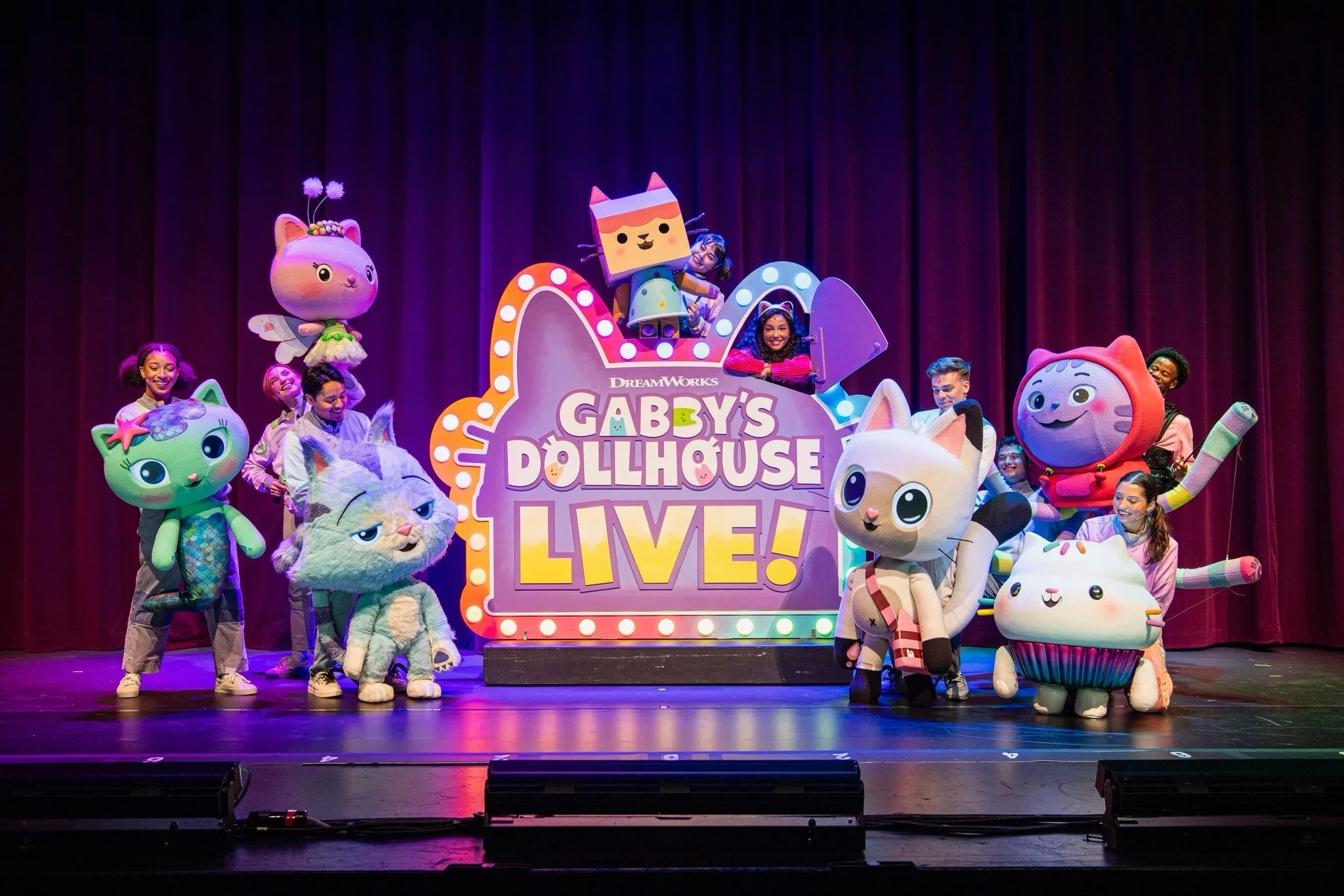 Gabby’s Dollhouse Live! is a theatrical show featuring Gabby and the unique Gabby Cats brought to life by a talented professional cast of singer/actor/puppeteers, unique hand-controlled puppets and a dynamic theatrical production design. An LED screen is also used as an animated backdrop to bring the show to life for the audience.